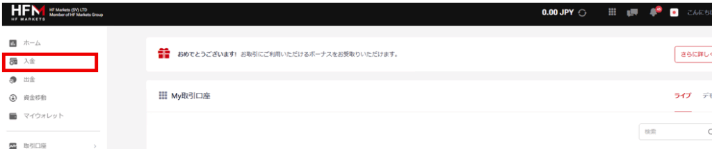 HFMのマイページから「入金」を選択