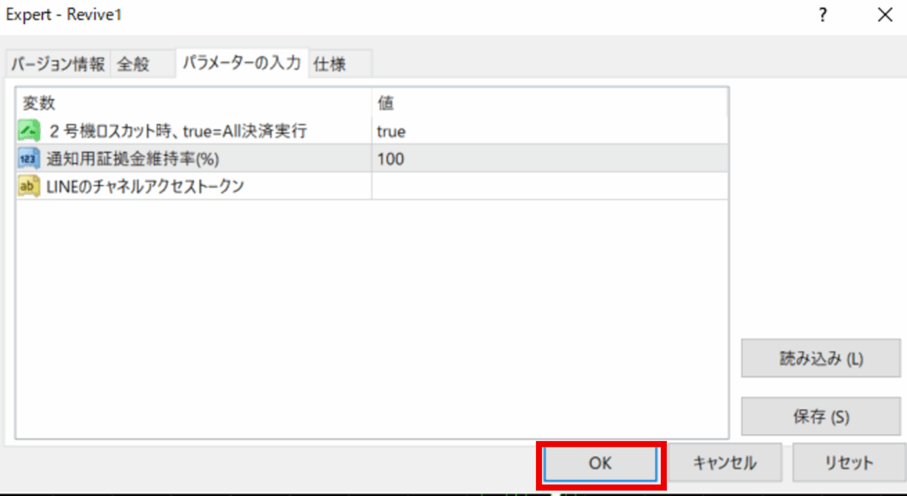 ③MT4同様に「パラメーターの入力」タブにて、パラメーターを入力します。