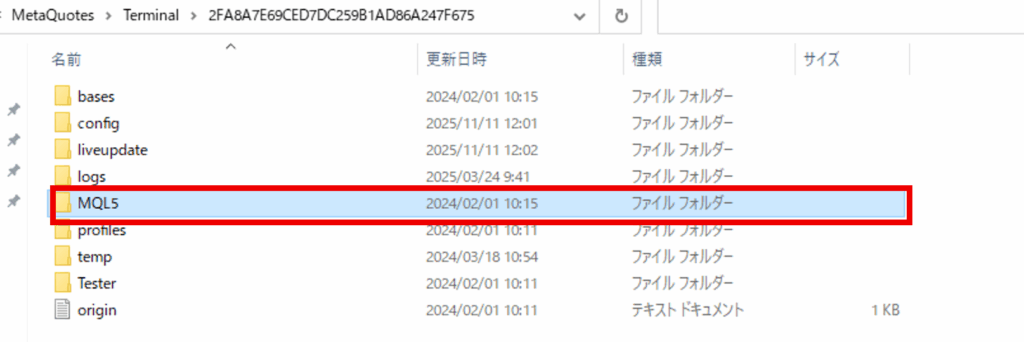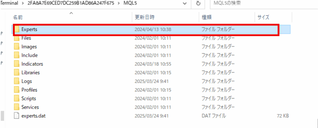 ①MT5の格納フォルダは「MQL5」→「Experts」フォルダになります。