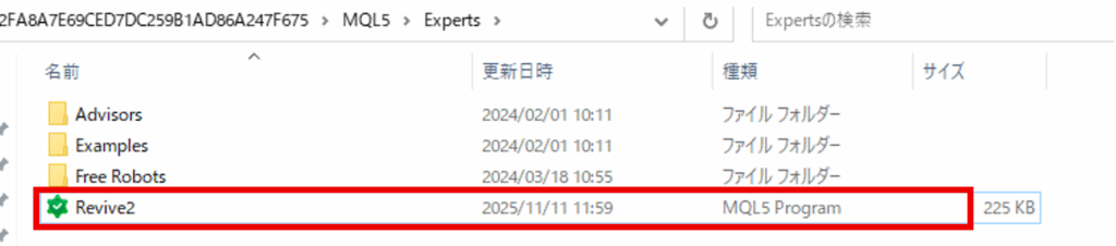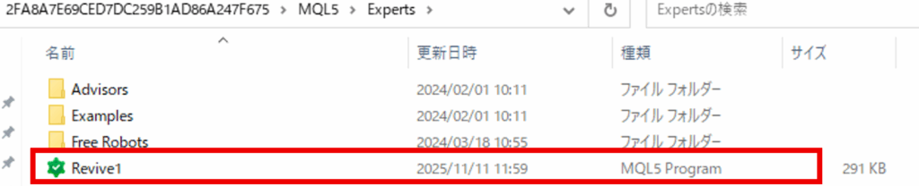 ②ダウンロードしたRevive1.ex5をフォルダへコピーして配置します。