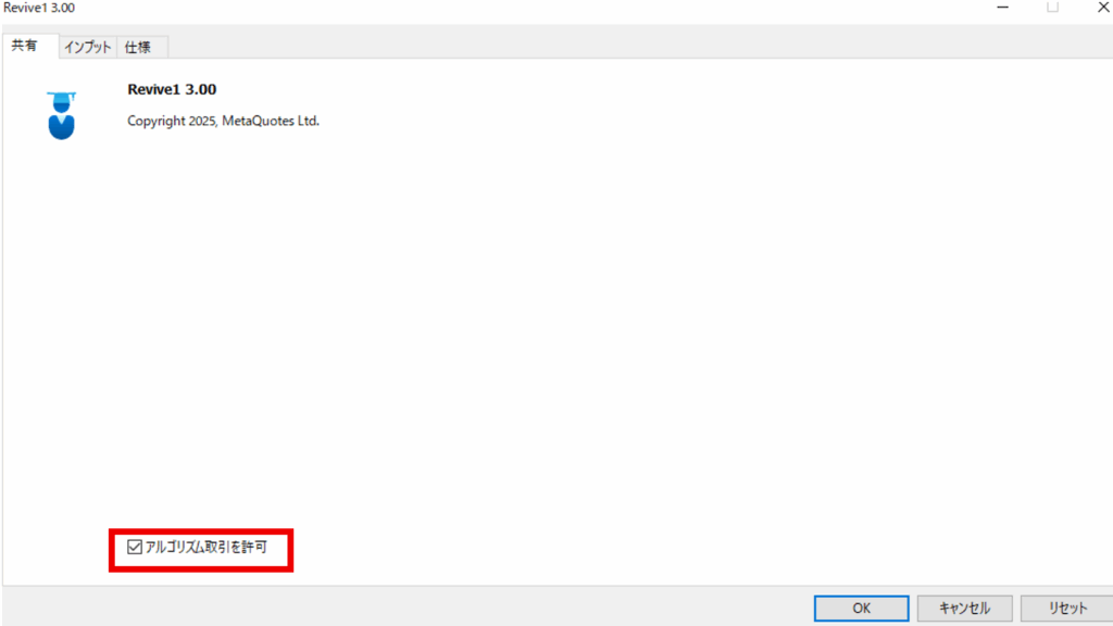 共有タブに移動し「アルゴリズム取引を許可」、仕様タブに移動し「DLLの使用を許可する」にチェックを追加する。